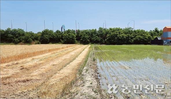 갓 벤 밀더미 옆으로 새로 이앙한 모가 고개를 내밀었다.