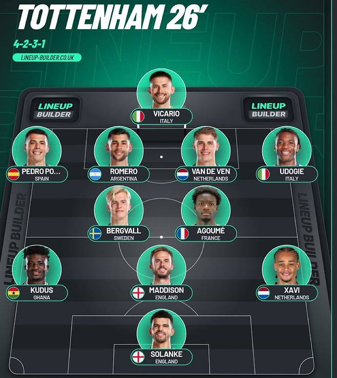 2선에는 더 큰 변화가 일어날 거로 예상했다. 제임스 매디슨(28)을 축으로 양 측면에 모하메드 쿠두스(24·웨스트 햄)와 사비 시몬스가(22·라이프치히)가 자리를 잡았다. 쿠두스와 시몬스 모두 토트넘이 고려하는 2선 옵션이다. 특히 쿠두스와는 이미 협상을 시작하는 등 긍정적인 기류가 흘러나왔다. 마지막으로 최전방에서는 구단 이적료 1위 기록을 보유한 도미닉 솔랑케(27)가 이름을 올렸다.