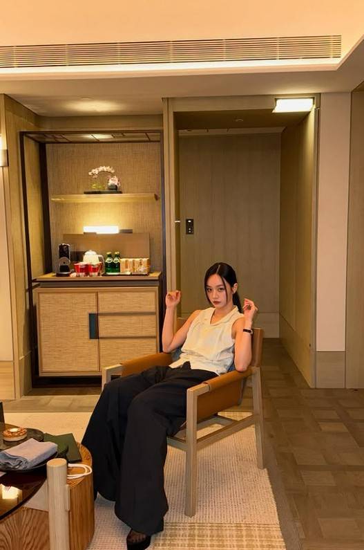 또 다른 스타일에서는 크림 컬러 민소매 셔츠에 여유로운 실루엣의 와이드 슬랙스를 매치해 세련된 클래식함을 연출했다. 소재의 흐름을 살린 자연스러운 핏과 톤온톤의 컬러 배치는 편안하면서도 단정한 무드를 자아내며 고급스러움을 배가시켰다.