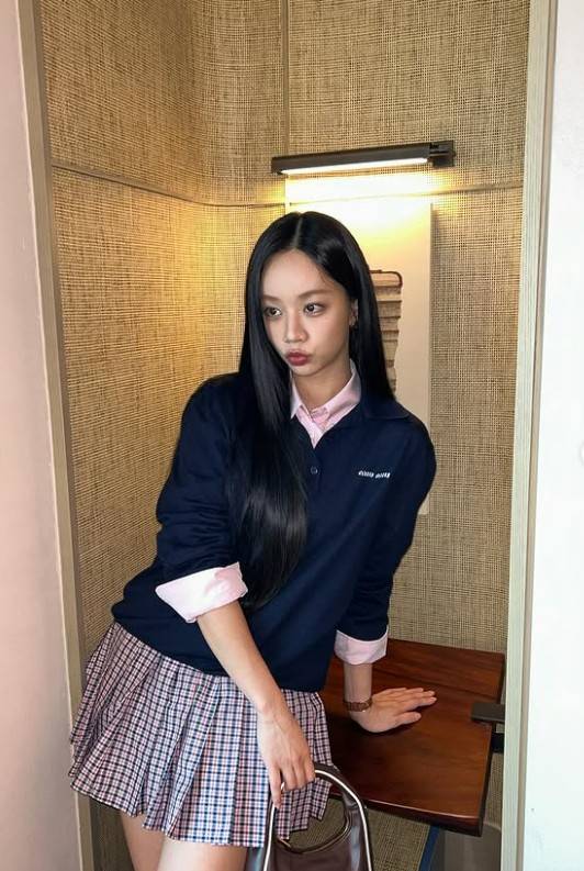 첫 번째 착장은 핑크 셔츠와 네이비 니트 스웨터를 레이어드한 룩이다. 소매를 걷어 올려 팔목을 드러내 손목 시계와 핸드백에 자연스레 시선이 가도록 했다. 여기에 체크 패턴의 플리츠 스커트를 매치해 단정하면서도 발랄한 무드를 완성했다. 밝은 색감과 클래식한 조합은 혜리의 맑은 이미지와 어우러졌다.