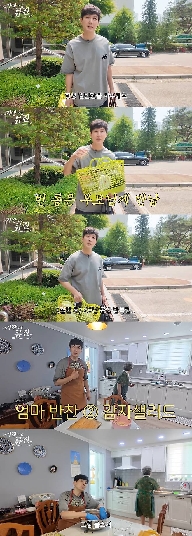 류진은 반찬통이 가득한 장바구니를 들고 부모님의 집을 찾았다. 류진은 "어머니와 장모님이 항상 밑반찬을 싸주신다. 빈손으로 오기 그러니까 수박을 같이 담아왔다. 빈 통을 드리면 그 빈 통에 또 반찬을 넣어서 가지고 가는 거다. 20년간 반복 중"이라고 전했다. 이어 "집사람도 바쁘니까 내가 반찬을 배워보려고 한다"라며 이날 어머니에게 반찬 만드는 방법을 배워보겠다고 했다.