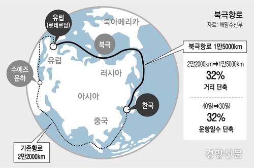 북극항로는 러시아 북쪽 북극해를 따라 아시아와 유럽을 잇는 항로다. 한국에서 유럽까지 기존 남쪽 항로를 이용할 때보다 거리는 2만2000㎞에서 1만5000㎞로, 운항 일수는 40일에서 30일로 줄어든다. 지금은 1년 중 7~10월에만 운항할 수 있고, 빙하 충돌 위험으로 러시아 쇄빙선의 호위를 받아야 한다.