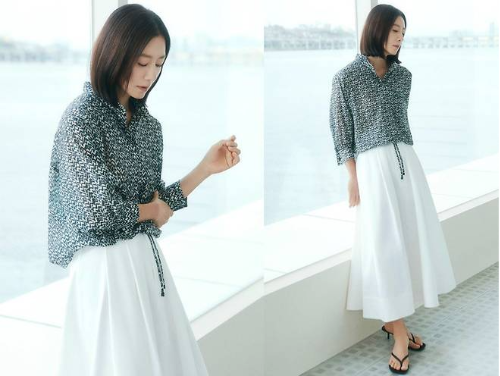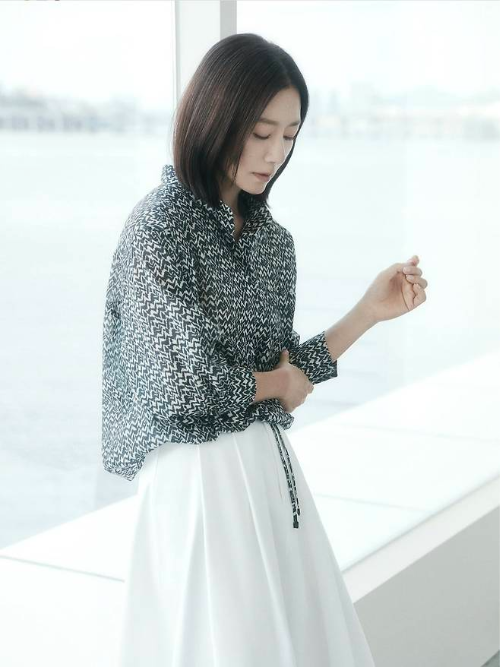 하이엔드 브랜드 쁘렝땅(PRENDANG)이 공개한 화보 속 김희애는 패턴 셔츠와 플레어 스커트를 조합한 모던룩으로 ‘균형의 미’를 선보였다.