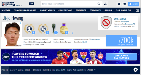 전 세계의 선수들을 대상으로 한 이적시장 전문 매체 ‘트랜스퍼마크트’는 황의조 선수 설명란에 ‘소속팀 없음’이라는 표기를 내걸었다. 아울러 가장 최근 활약한 구단에는 알란야스포르가 기입되어 있었다. 황의조는 새 팀을 찾아야 하는 상황이다.