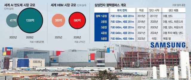 하지만 최근 10㎚(나노미터·10억분의 1m) 6세대 D램, 5세대 HBM(HBM3E) 등 핵심 제품의 기술력이 회복되자 연내 P5 건설 재개를 검토한 것으로 전해진다. 특히 AI 반도체 수요가 지속적으로 증가할 것이라는 전망이 투자 재개에 힘을 실었다. 수출입은행에 따르면 AI 반도체 시장 규모는 2022년 411억 달러에서 P5가 가동될 2028년에는 1330억 달러로 커질 것으로 예상된다. 삼성전자 관계자는 “P5 공사 재개에 대해 다양한 시나리오를 놓고 검토 중”이라고 말했다.