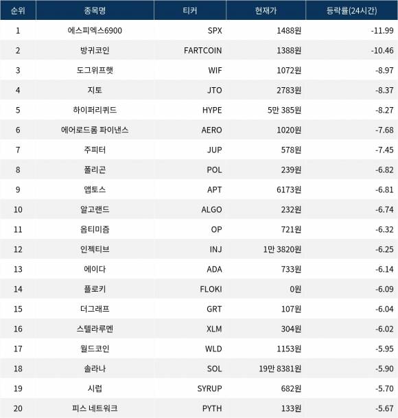 [서울데이터랩]에스피엑스6900·방귀코인·도그위프햇, 24시간 하락률 상위