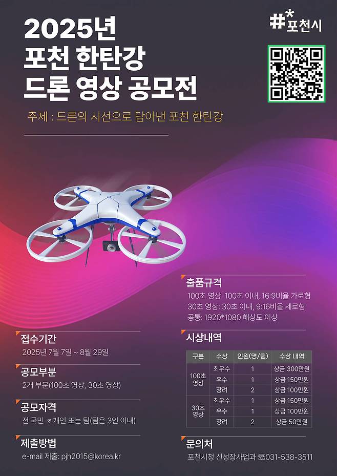 총 상금은 1000만원이며, 수상작은 오는 10월 열리는 ‘포천 한탄강 세계드론제전’ 현장에서 상영될 예정이다. 아울러 포천시청 공식 유튜브, SNS, 관광홍보물 등 다양한 디지털 매체에도 활용된다.