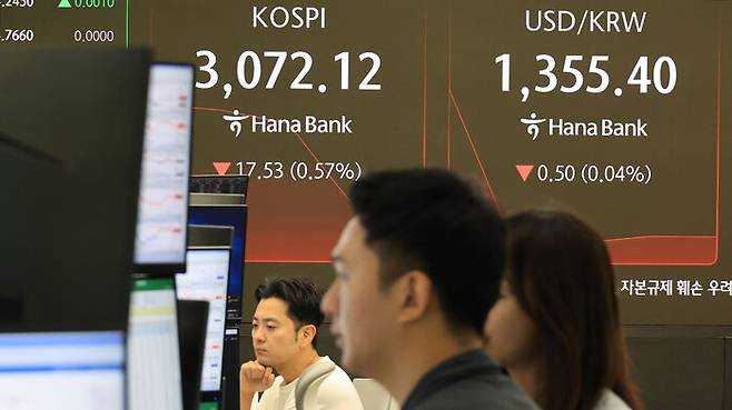▲ 2일 서울 중구 하나은행 본점에서 직원들이 증시와 환율을 모니터하고 있다.