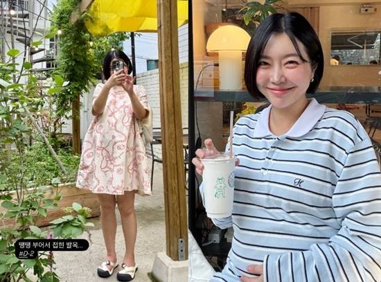 사진 속 레이디 제인은 허영지의 친언니 허송연과 만나 여유로운 시간을 보내고 있다. 이 가운데 짧은 원피스 아래로 드러난 다리와 발목은 부종으로 인해 눈에 띄게 부어 있는 모습이다.