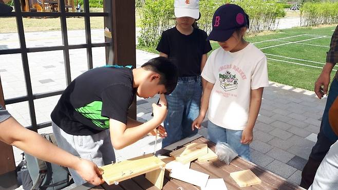 | ▲ 둥지상자를 조립하는 습지학교 아이들 |