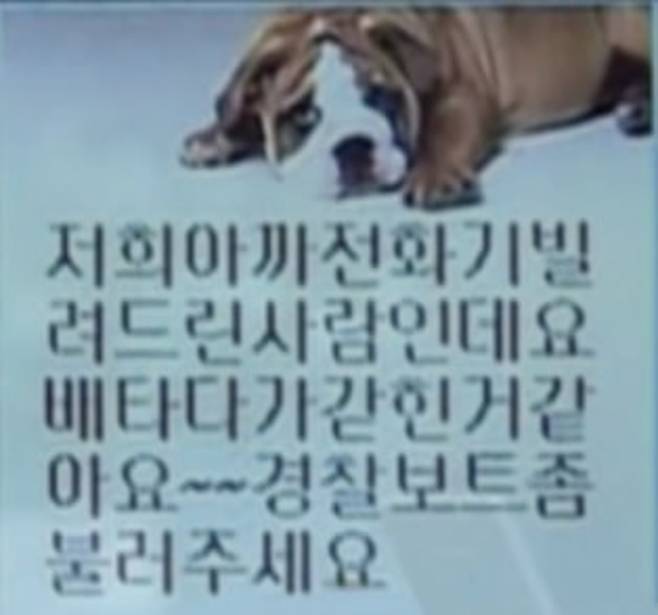 ◇ 김현정> 어떤 문자 메시지인지 지금 화면으로 한번 보시죠. 여러분, 실제 문자 메시지입니다. 피해자가 보낸 문자 메시지. 저희 아까 전화기 빌려드린 사람인데요. 배 타다가 갇힌 것 같아요. 경찰 보트 좀 불러주세요. 띄어쓰기도 없이 아주 급박하게 쓴 느낌이에요.