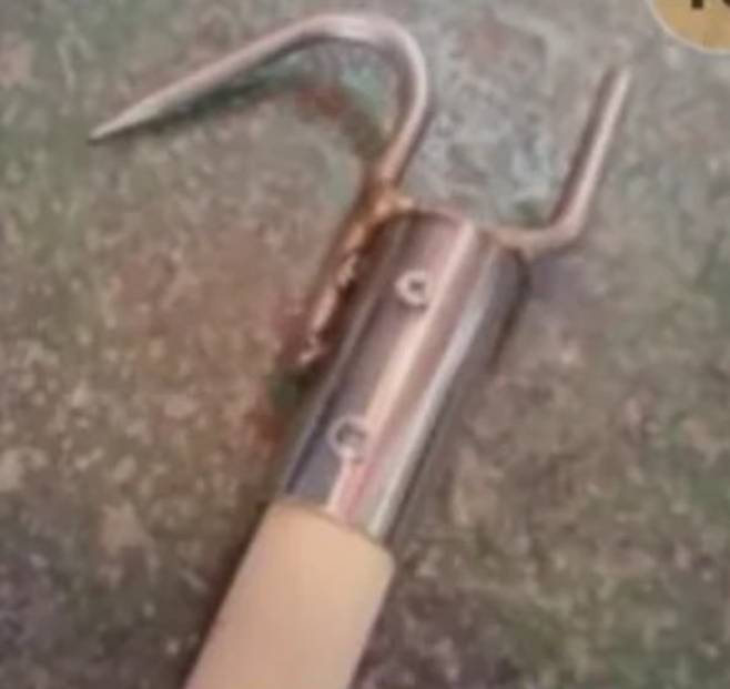 ◆ 손수호> 지금 화면으로도 나오고 있죠. 굉장히 좀 날카로운 갈고리같이 생긴 건데요. 굉장히 길어요. 창처럼 보시면 되겠는데 이게 갈고리 달린 긴 막대 형태의 도구, 어업 도구고요.