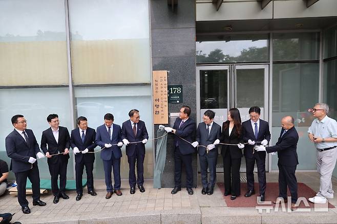 [서울=뉴시스] 권창회 기자 = 이명현 채상병 특별검사를 비롯한 특검보가 2일 오전 서울 서초구에 마련된 특검 사무실에서 현판식을 하고 있다. 2025.07.02. kch0523@newsis.com