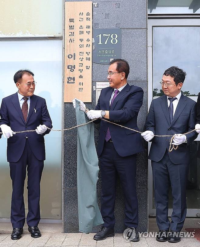 (서울=연합뉴스) 김도훈 기자 = 이명현 순직해병 특별검사가 2일 서울 서초구 특검 사무실에서 진행된 현판식에서 행사 직전 현판에서 떨어지는 천막을 잡고 있다.