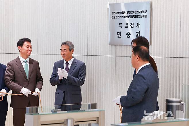 [서울=뉴시스] 배훈식 기자 = 윤석열 전 대통령의 부인 김건희 여사 의혹 관련 사건을 맡은 민중기 특별검사가 2일 오전 서울 종로구 KT광화문빌딩 웨스트에 마련된 특검 사무실에서 현판 제막식에서 박수를 치고 있다. (공동취재) 2025.07.02. photo@newsis.com