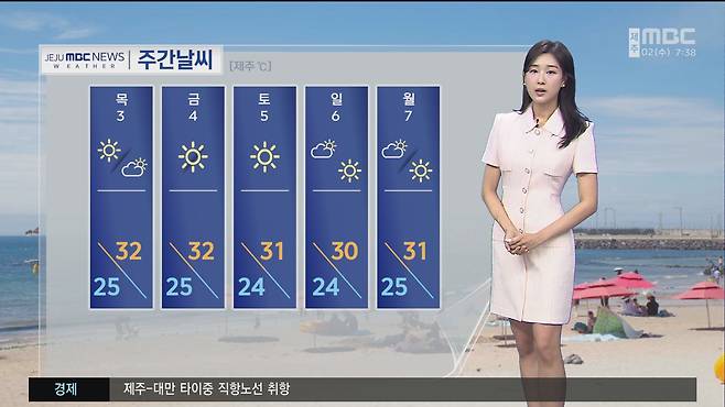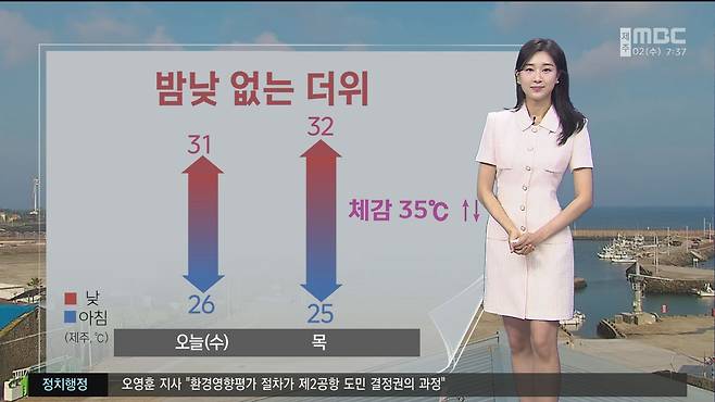 지역별 기온 보겠습니다. 아침 현재 기온은 북부 26도, 서부 25도 보이고 있습니다. 남부 27도, 산지 성판악 21도로 시작하고 있습니다. 낮 최고 기온은 북부 31도, 서부 29도, 남부 31도, 산지 성판악 28도로 예상됩니다. 도서지역도 대체로 맑은 가운데 폭염이 기승을 부리겠습니다. 특히, 우도는 31도까지 오르면서 후텁지근하겠습니다. 바다의 물결은 다소 잔잔하게 일겠는데요. 해상과 해안 지역을 중심으로 짙은 안개가 끼는 곳이 있겠습니다. 항공기 운항에 차질이 있을 수 있어, 미리 운항 정보 꼭 확인하시기 바랍니다. 본격적인 여름이 시작되면서 무더위가 점점 깊어지고 있습니다. 더위에 지치지 않게 가벼운 옷차림과 수분 섭취 잘 해주셔야겠습니다. 날씨였습니다.