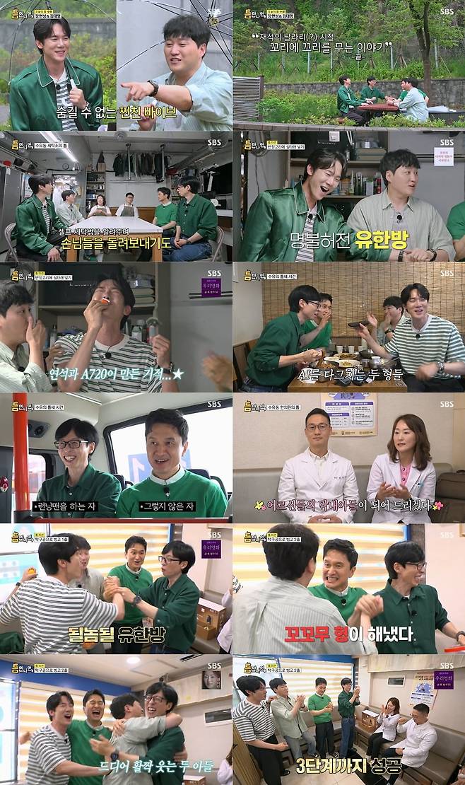 장현성은 대학 동문인 유재석과의 만남에 시작부터 폭로전을 열었다. 장현성이 “새벽에 교문 앞에서 양복 입고, 머릿기름을 그렇게 바르고 오더라”라며 생생하게 회상했다. 그런가 하면, 김대명은 찐친 유연석의 MC석을 노려 웃음을 자아냈다. 김대명은 틈 장소 정보를 줄줄 읊더니, 유연석에게 “이런 건 다 준비해야지. 항상 긴장해. 옷 잘 입는다고 되는 게 아니야”라며 너스레를 떨었다. 이에 유재석이 “대명이도 연석이한테는 막 하네”라고 웃음을 터트리자, 유연석은 “대명이 형이 저한텐 차태현 형 같은 존재”라고 덧붙여, 리얼한 '슬의생' 찐친 케미를 발산했다.