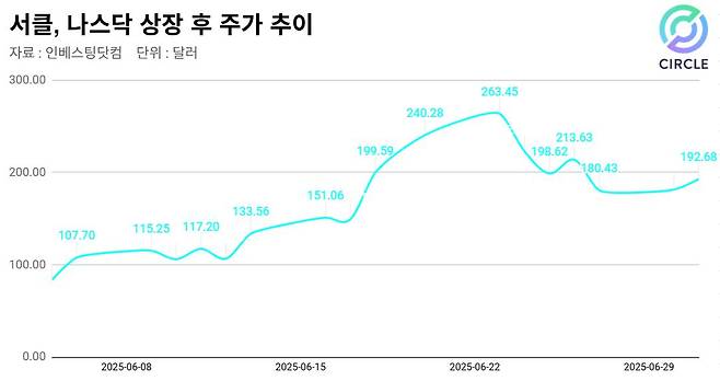 서클 주식은 지난달 5일 상장 이후 공모가(31달러) 대비 9배가 넘는 가격에 거래되기도 했다. 현재 주가도 공모가보다 6배 이상 높다. JP모건은 “서클은 훌륭한 기업이지만, 지금은 살 때가 아니다”라며 “현재 주가는 너무 비싸고, 금리나 경쟁 위협을 과소평가한 상태”라고 했다.