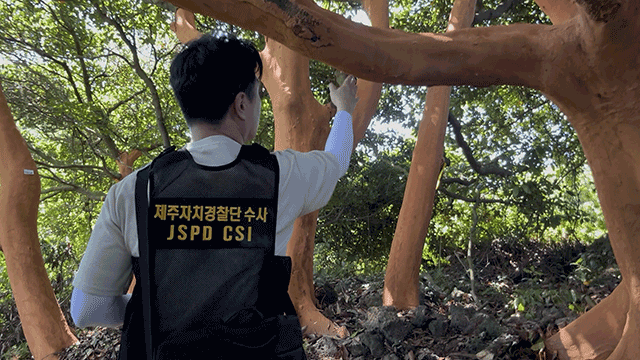 제주도 자치경찰단은 서귀포시 표선면 성읍리 임야에서 후박나무 백여 그루의 껍질을 벗긴 50대 남성을 산림자원법 위반 혐의로 검거해 조사 중이라고 오늘(2일) 밝혔습니다.