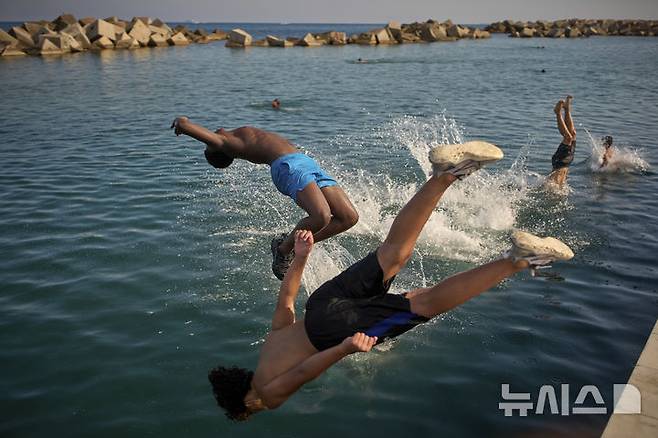 [바르셀로나=AP/뉴시스] 스페인에 무더위가 이어진 1일(현지 시간) 바르셀로나 해변에서 남성들이 물로 뛰어들고 있다. 2025.07.02.