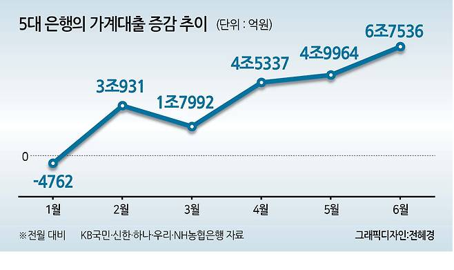 5대 은행 가계대출 6월에만 6.7조 폭증
