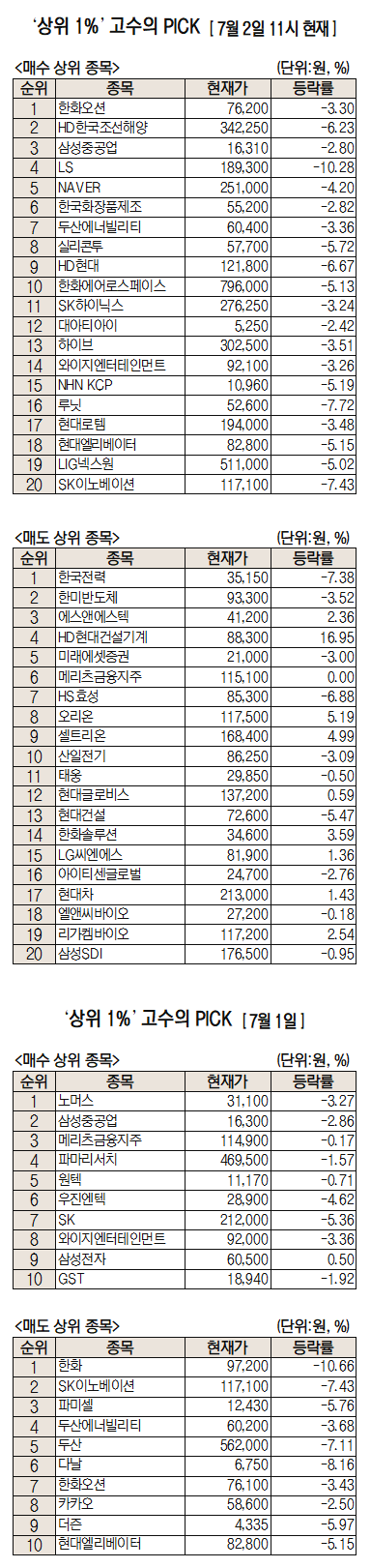 이날 미래에셋증권에 따르면 미래에셋증권 주식 거래 고객 중 최근 1개월간 투자수익률 상위 1%에 해당하는 ‘주식 초고수’들이 오전 11시까지 가장 많이 사들인 종목은 한화오션이다.