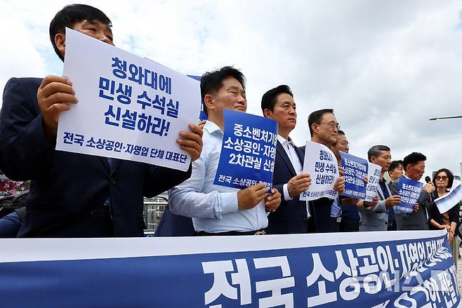 [서울=뉴시스] 박주성 기자 = 전국 소상공인·자영업 단체대표단이 2일 서울 용산 대통령실 앞에서 정부 조직 개편 요구안 전달 기자회견을 하고 있다. 2025.07.02. park7691@newsis.com