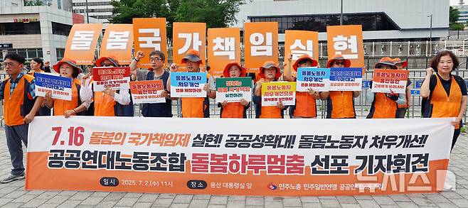 [서울=뉴시스] 박주성 기자 = 2일 서울 용산 대통령실 앞에서 열린 공공연대노동조합 돌봄하루멈춤 선포 기자회견에서 참석자들이 구호를 외치고 있다. 2025.07.02. park7691@newsis.com