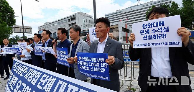 [서울=뉴시스] 박주성 기자 = 전국 소상공인·자영업 단체대표단이 2일 서울 용산 대통령실 앞에서 정부 조직 개편 요구안 전달 기자회견을 하고 있다. 2025.07.02. park7691@newsis.com