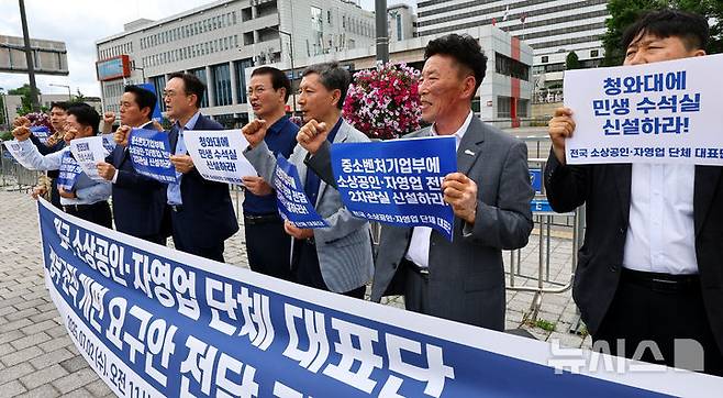 [서울=뉴시스] 박주성 기자 = 전국 소상공인·자영업 단체대표단이 2일 서울 용산 대통령실 앞에서 정부 조직 개편 요구안 전달 기자회견 중 구호룰 외치고 있다. 2025.07.02. park7691@newsis.com