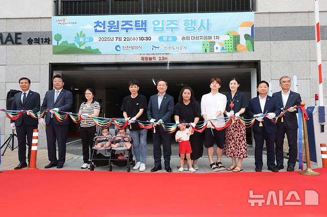 [인천=뉴시스] 전진환 기자 = 유정복(가운데) 인천시장이 2일 오전 인천 미추홀구 숭의동의 천원주택(매입임대주택) 입주행사에서 주형환(왼쪽 두번쨰) 저출산고령사회위원회 부위원장 및 입주자 가족 등과 테이프커팅을 하고 있다. 2025.07.02. amin2@newsis.com