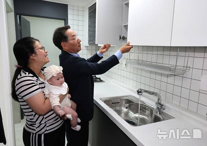 [인천=뉴시스] 전진환 기자 = 유정복 인천시장이 2일 오전 인천 미추홀구 숭의동의 천원주택(매입임대주택) 입주행사에서 입주자 가족과 내부를 둘러보고 있다. 2025.07.02. amin2@newsis.com