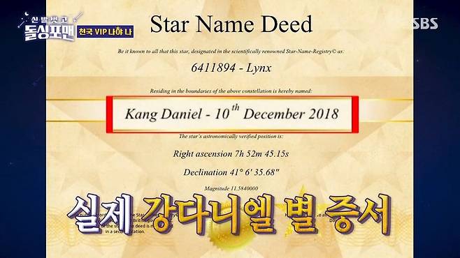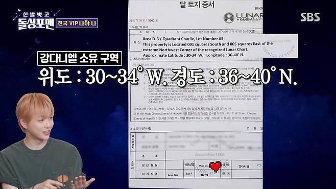 이어 강다니엘이 실제 보유 중인 '별 증서'가 공개됐고, 탁재훈은 "실제로 사서 선물을 해주신 거냐. 달나라 땅도 선물해 주셨다던데"라고 놀라움을 감추지 못했다.