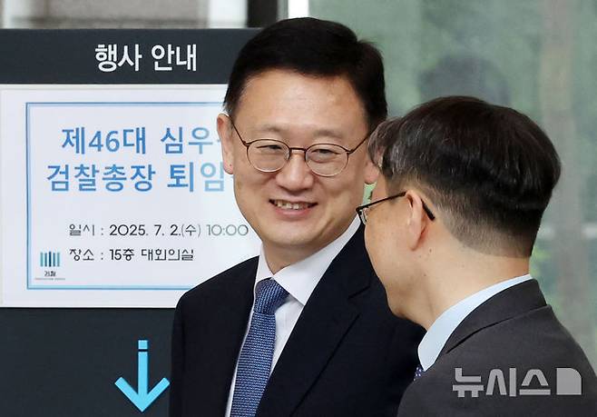 [서울=뉴시스] 조성우 기자 = 박세현 서울고검장이 2일 서울 서초구 대검찰청에서 심우정 전 검찰총장 환송을 한 뒤 관계자와 대화하고 있다. 2025.07.02. xconfind@newsis.com