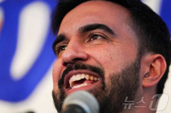 (뉴욕 로이터=뉴스1) 김경민 기자 = 조란 맘다니가 6월 25일(현지시간) 뉴욕시장을 뽑는 선거에 출마할 민주당 후보를 선출하는 예비선거 행사에서 연설하고 있다. 2025.6.25
