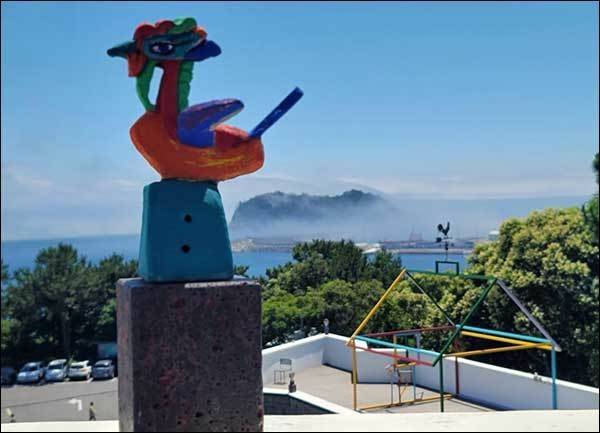 | ▲ 옥상 조각작품 왈종미술관 옥상에는 조각작품들이 전시되어 있다. 앞에 푸른 나무숲 아래가 정방폭포다. |