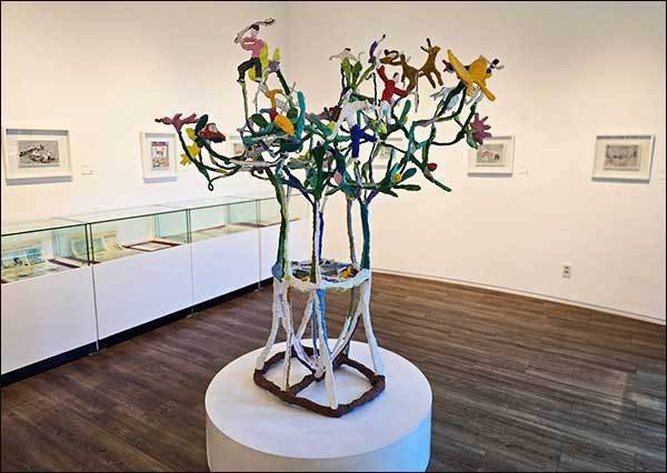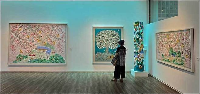 제주 서귀포 왈종미술관 1층 전시실에 들어서면 이왈종 화백의 마음이 담긴 글이 벽면을 장식하고 있다. 탁 트인 전시공간이 아니라 미로처럼 좁고 아담한 전시관 안에는 '아기자기하고 알록달록한 빛깔의 크고 작은 그림과 조각 작품'들이 가득하다.