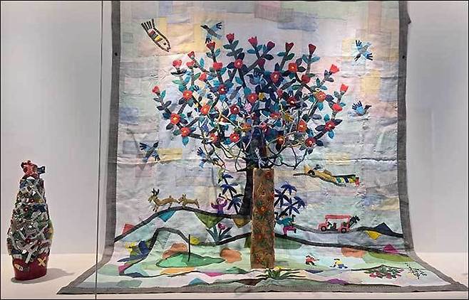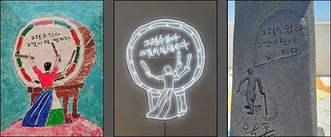| ▲ 그럴수 있다 그럴수 있다 그것이 인생이다' 라는 내용의 그림, 형광시설로 설치된 것, 옥상 전시관의 작품 일부(왼쪽부터) |