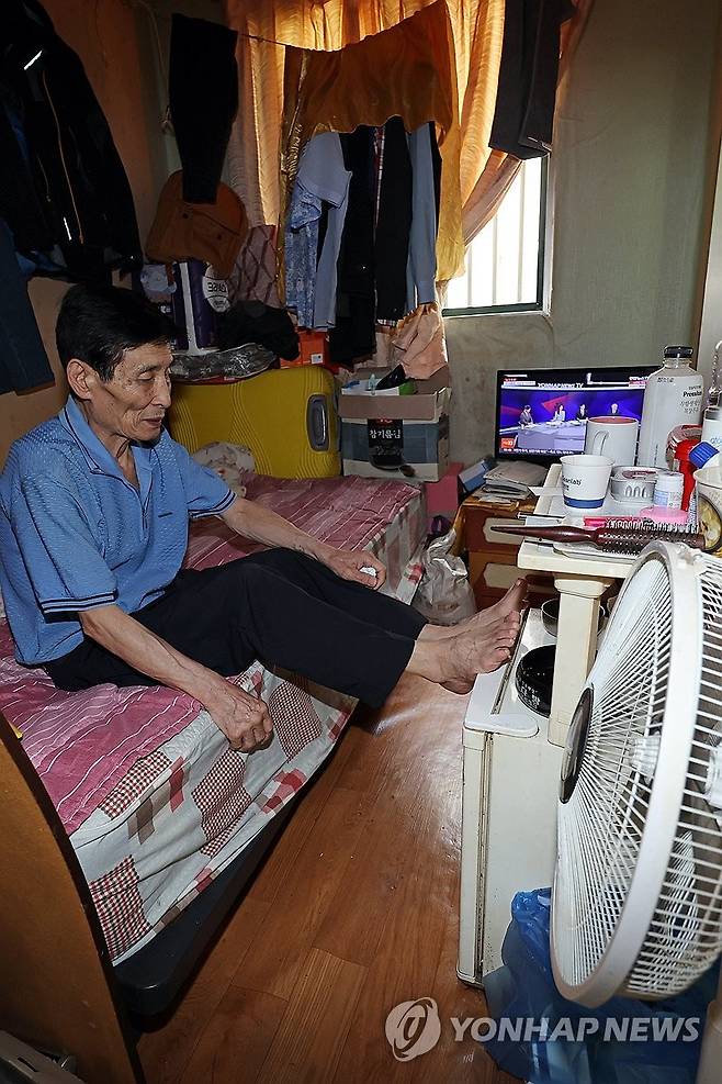 (광주=연합뉴스) 김혜인 기자 = 연일 폭염경보가 이어지는 2일 광주 동구 대인동 한 쪽방촌에서 주민 강성문(76) 씨가 더위를 날리기 위해 선풍기 바람을 쐬고 있다. 2025.7.2