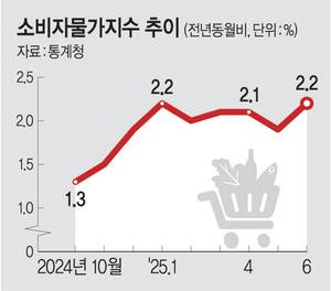 지난해 9∼12월 1%대를 유지하던 소비자물가 상승률은 올 1월 2.2%로 올라선 뒤 4개월 연속 2%대 초반을 유지하다가 5월 1.9%로 내려갔다. 하지만 지난달 다시 2%대를 기록하며 5개월 만에 가장 높은 상승 폭을 나타냈다. 특히 자주 구매하는 품목 위주로 구성돼 체감물가에 가까운 생활물가지수 상승률은 2.5%를 기록했다.