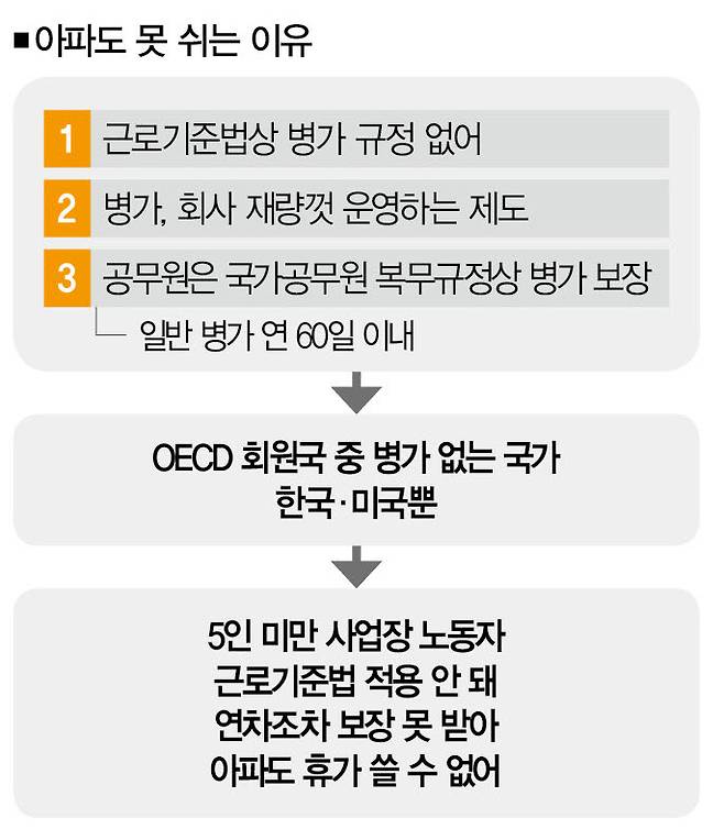 특히 규모가 작은 회사에 다니는 직장인의 상황은 더 열악합니다. 근로기준법이 적용되지 않는 '5인 미만 사업장'에서 일하는 직장인들은 병가는커녕 연차조차 보장받지 못합니다. 아플 때 병가 대신 쓸 수 있는 연차도 없다는 겁니다.