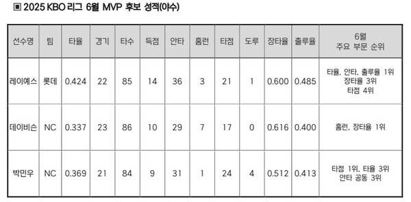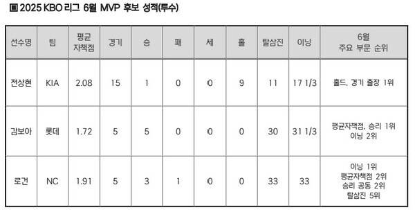 투수 중에서는 전상현(KIA 타이거즈), 감보아(롯데 자이언츠), 로건 앨런(NC 다이노스), 야수 중에는 빅터 레이예스(롯데), 맷 데이비슨(NC), 박민우가(NC) 6월 월간 MVP 수상을 노린다.