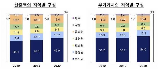 산출액의 경우 수도권 다음으로는 동남권(15.4%), 충청권(13.7%) 순이었다. 수도권과 충청권의 비중은 확대된 반면, 동남권·대경권·호남권의 비중은 축소됐다. 시도별로 보면 경기가 25.8%로 가장 높았고, 서울(19.3%), 충남(7.1%)이 뒤를 이었다.
