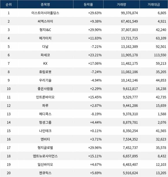 거래량 3위인 형지I&C(011080)는 37,807,803주가 거래되며 주가가 1,173원으로 폭등하고 있다. 4위인 메가터치(446540)는 13,721,715주가 거래되며 주가가 4,490원으로 급등세를 보인다. 5위 다날(064260)은 13,162,389주가 거래되며 주가가 6,820원으로 하락하고 있다. 6위 파세코(037070)는 11,905,178주가 거래되며 주가가 9,820원으로 상승세를 기록하고 있다. 7위 KX(122450)는 11,482,175주가 거래되며 주가가 5,420원으로 상승 중이다. 8위 휴림로봇(090710)은 11,082,186주가 거래되며 주가가 3,140원으로 하락하고 있다. 9위 우리기술(032820)은 10,142,146주가 거래되며 주가가 4,430원으로 하락하고 있다. 10위 좋은사람들(033340)은 9,612,817주가 거래되며 주가가 1,695원으로 상승세를 보인다.