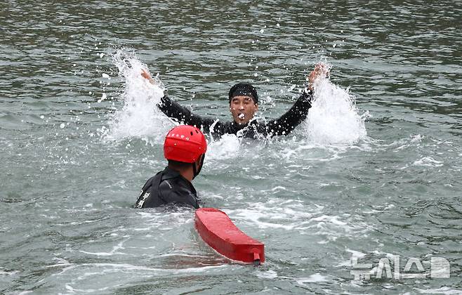 [인천=뉴시스] 전진환 기자 = 부평소방서 119구조대원들이 2일 인천 중구 을왕동 왕산마리나에서 여름철 수난구조 훈련을 하고 있다. 2025.07.02. amin2@newsis.com
