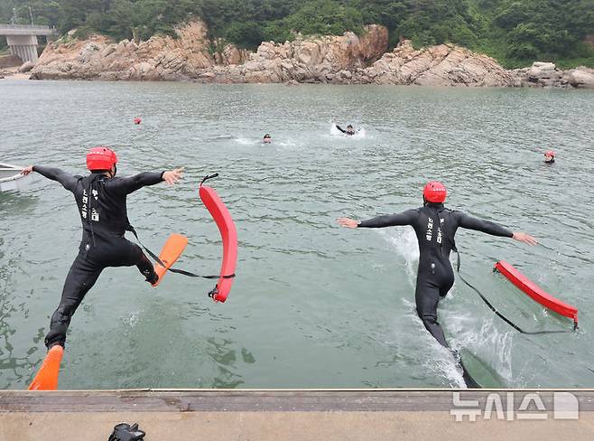 [인천=뉴시스] 전진환 기자 = 부평소방서 119구조대원들이 2일 인천 중구 을왕동 왕산마리나에서 여름철 수난구조 훈련을 하고 있다. 2025.07.02. amin2@newsis.com