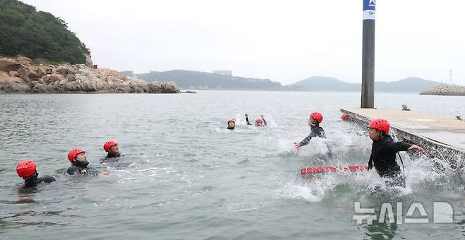 [인천=뉴시스] 전진환 기자 = 부평소방서 119구조대원들이 2일 인천 중구 을왕동 왕산마리나에서 여름철 수난구조 훈련을 하고 있다. 2025.07.02. amin2@newsis.com