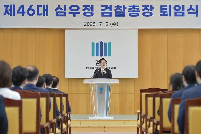 [서울=뉴시스] 심우정 검찰총장이 2일 서울 서초구 대검찰청에서 열린 퇴임식에서 퇴임사를 하고 있다. (사진=대검찰청 제공) 2025.07.02. photo@newsis.com *재판매 및 DB 금지