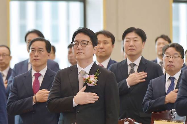 [서울=뉴시스] 심우정 검찰총장이 2일 서울 서초구 대검찰청에서 열린 퇴임식에서 국민의례를 하고 있다. (사진=대검찰청 제공) 2025.07.02. photo@newsis.com *재판매 및 DB 금지