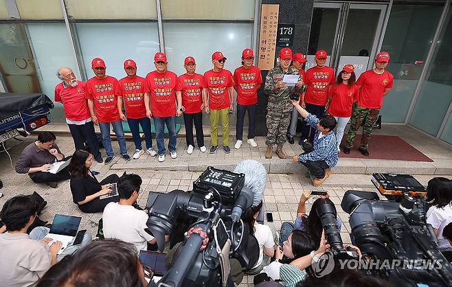 (서울=연합뉴스) 김도훈 기자 = 순직 해병 특검이 공식적으로 출범한 2일 서울 서초구 특검 사무실 앞에서 해병대예비역연대 회원들이 사건 진상 규명 촉구 기자회견을 하고 있다. 2025.7.2